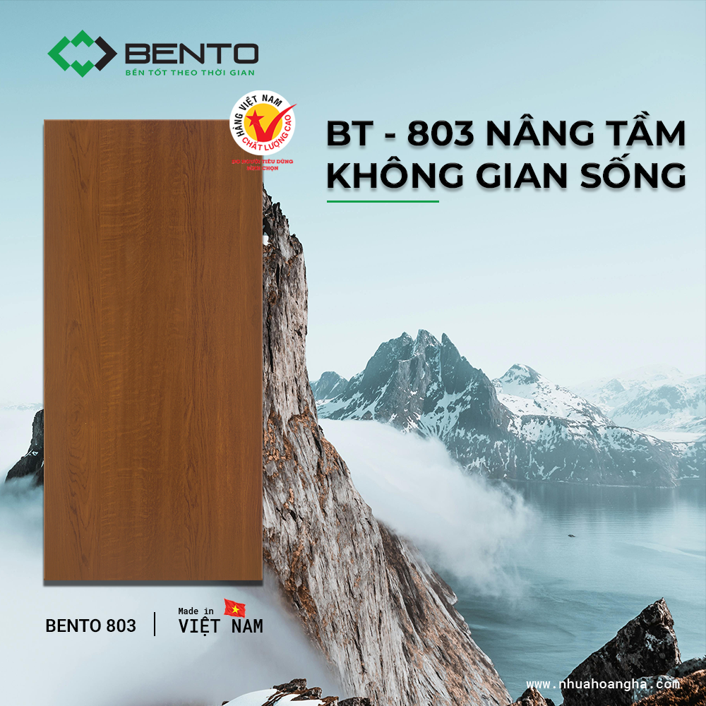 - Tấm nhựa Bento mang lại giá trị thẩm mỹ cao với các mẫu vân gỗ 3D chân thực, phù hợp cho các thiết kế nội thất cao cấp. Khả năng cách âm tốt (giảm 32dB) cũng là ưu điểm đáng kể trong các căn hộ chung cư.