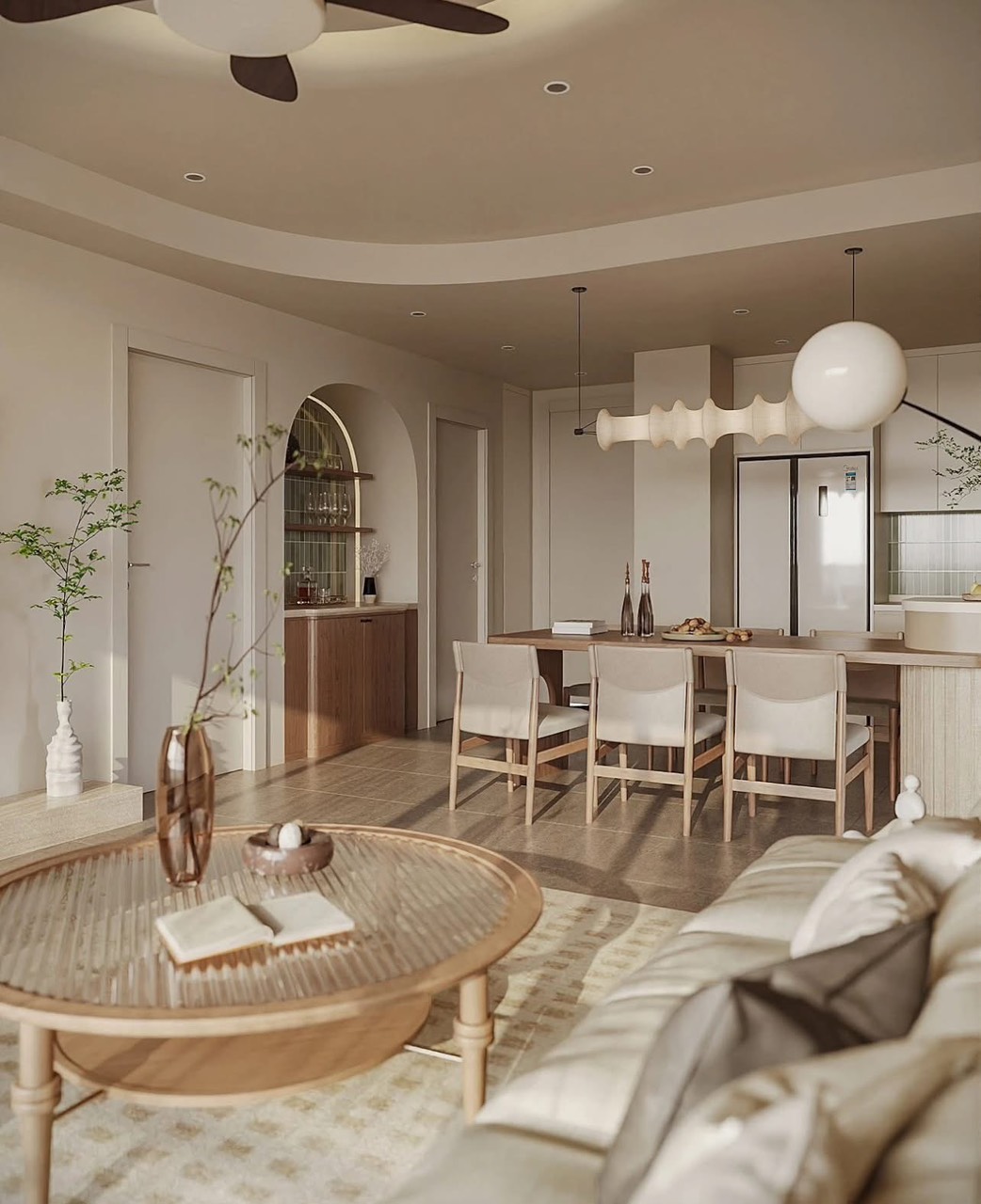 Một trong những điểm nhấn quan trọng nhất của xu hướng bếp tối giản 2025 chính là thiết kế không gian mở. Bếp và phòng ăn được kết nối một cách tự nhiên, không có vách ngăn cứng nhắc. Điều này tạo cảm giác rộng rãi, thoáng đãng cho toàn bộ khu vực sinh hoạt chung.